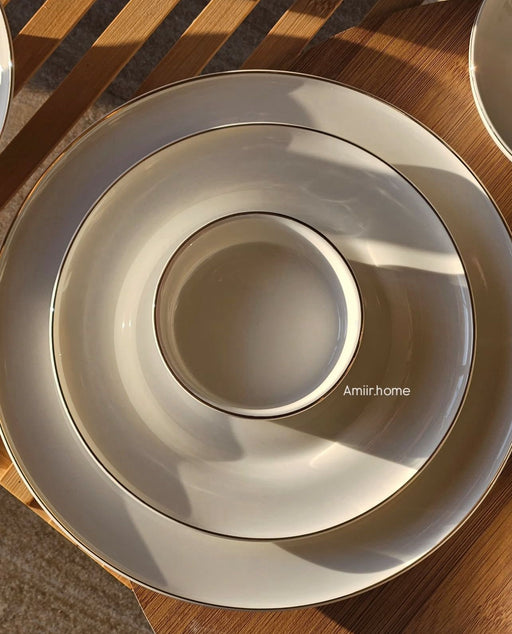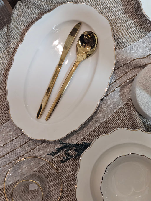 Gold rim12 large plates for steak 12 medium plates for stew 12 medium plates for dessert 12 soup bowls 2 large serving bowls 2 rice pots